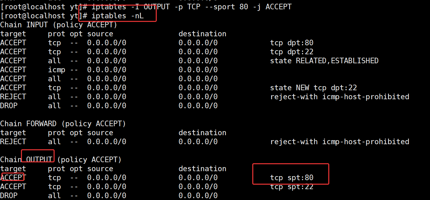 [root@localhost yt]# iptables -I OUTPUT -p TCP --sport 80 -j ACCEPT