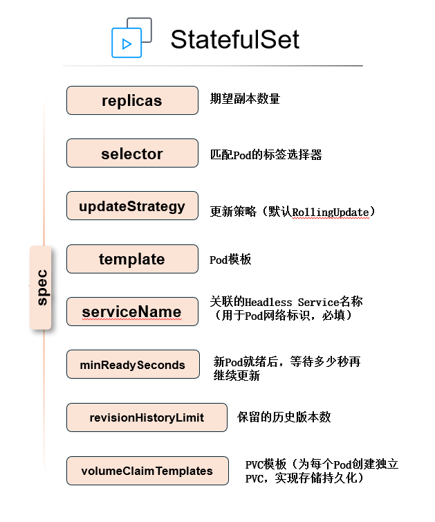 核心字段围绕 "稳定标识""有序部署 / 更新"、"存储持久化" 设计。