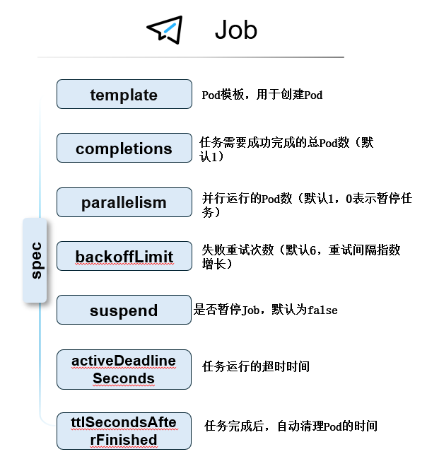 template: <PodTemplateSpec> # Pod模板(任务容器定义,需确保容器正常退出(exit 0))