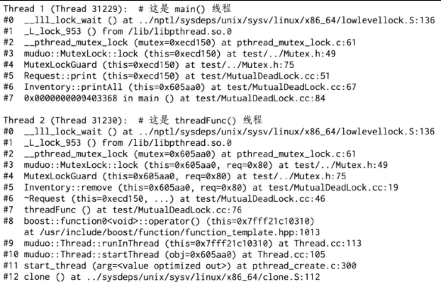 ● 在每次构造Guard对象的时候,思考一路上(调用栈上)已经持有的锁,防止因加锁顺序不同而导致死锁(deadlock)。由于Guard对象是栈上对象,看函数调用栈就能分析用锁的情况,非常便利。