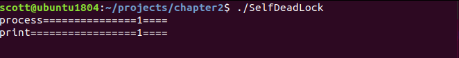 前面说过,如果坚持只使用Scoped Locking,那么在出现死锁的时候很容易定位。考虑下面这个线程自己与自己死锁的例子(recipes/thread/test/SelfDeadLock.cc)。