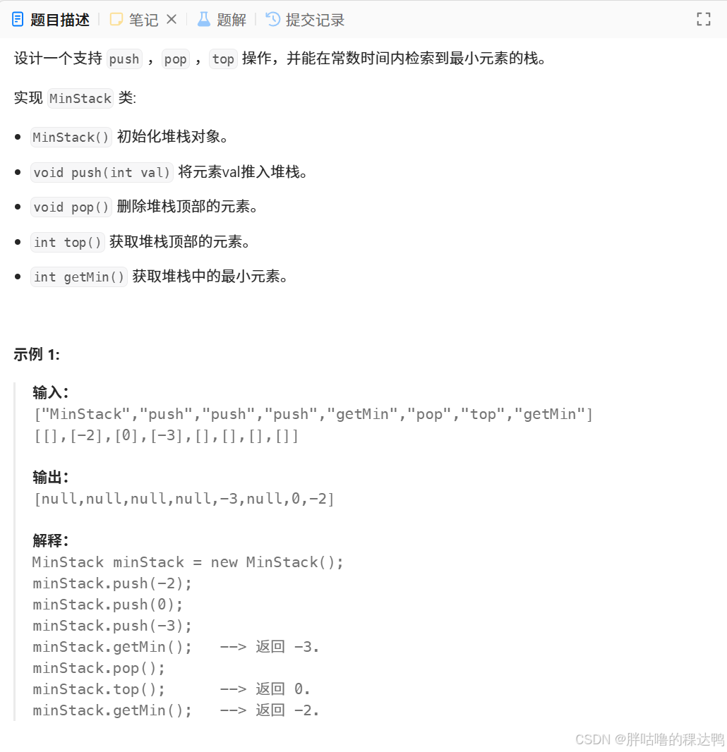 这个题目需要设计一个特殊的栈(被称为最小栈),它需要支持普通栈的push,pop,top等操作,同时还需要在常数时间(O(1))内找到栈中的最小元素,通过getMin()实现。