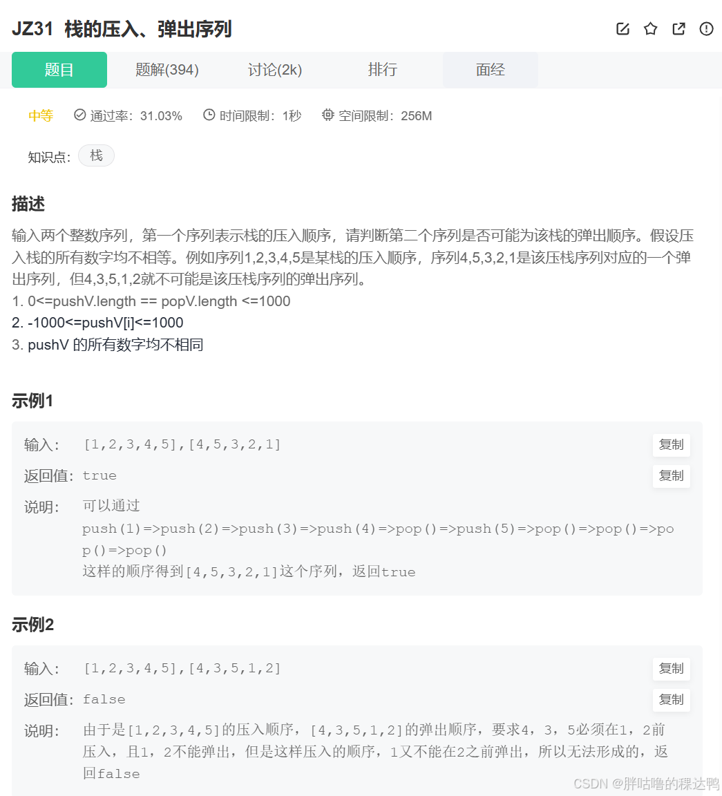 判断第二个整数序列是否是第一个整数序列(表示栈的压入顺序)对应的弹出顺序;通俗一点解释,栈的特点是"先进后出",比如往栈中压入1-2-3,弹出的顺序只能是3-2-1,第一个序列,压入顺序:1-2-3-4-5,第二个序列,需要判断的弹出顺序,随时压入,随时弹出。