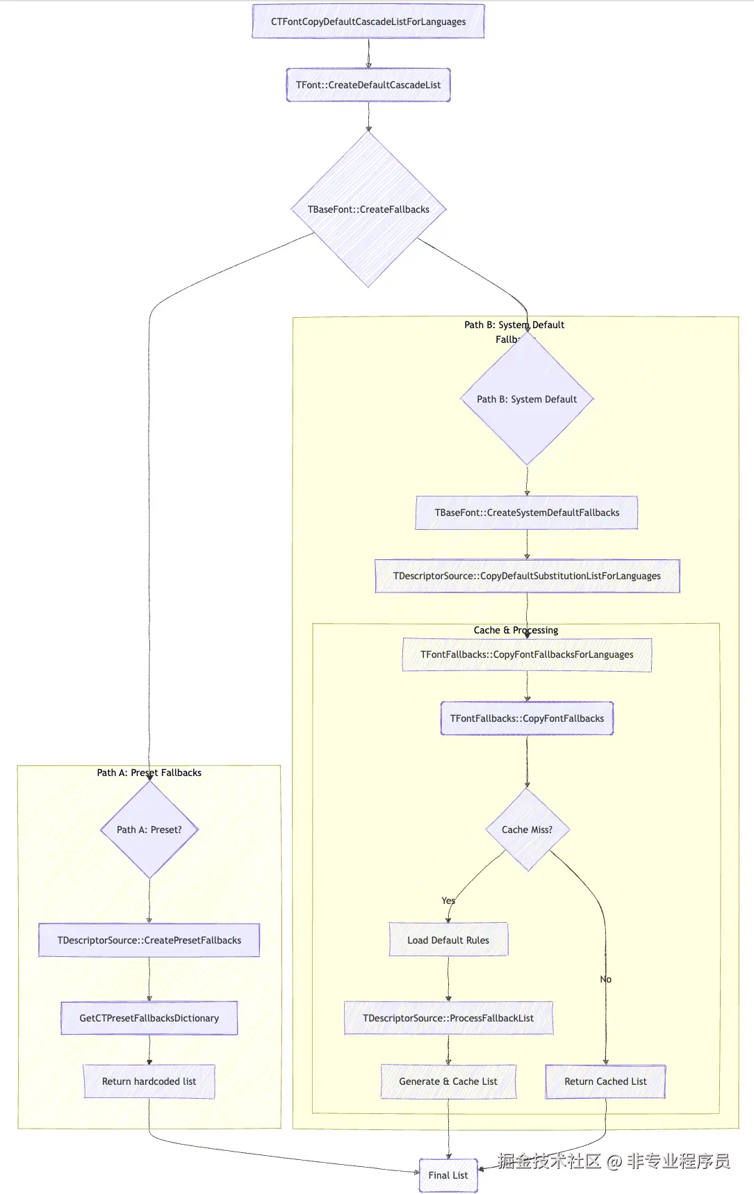- Preset Fallbacks:系统预设Fallback,这是一个"快速通道",系统内部维护了一个针对特定字体(如系统UI字体)的硬编码Fallback列表,如果请求的主字体在这个预设列表中,系统会直接使用这个列表,速度非常快。