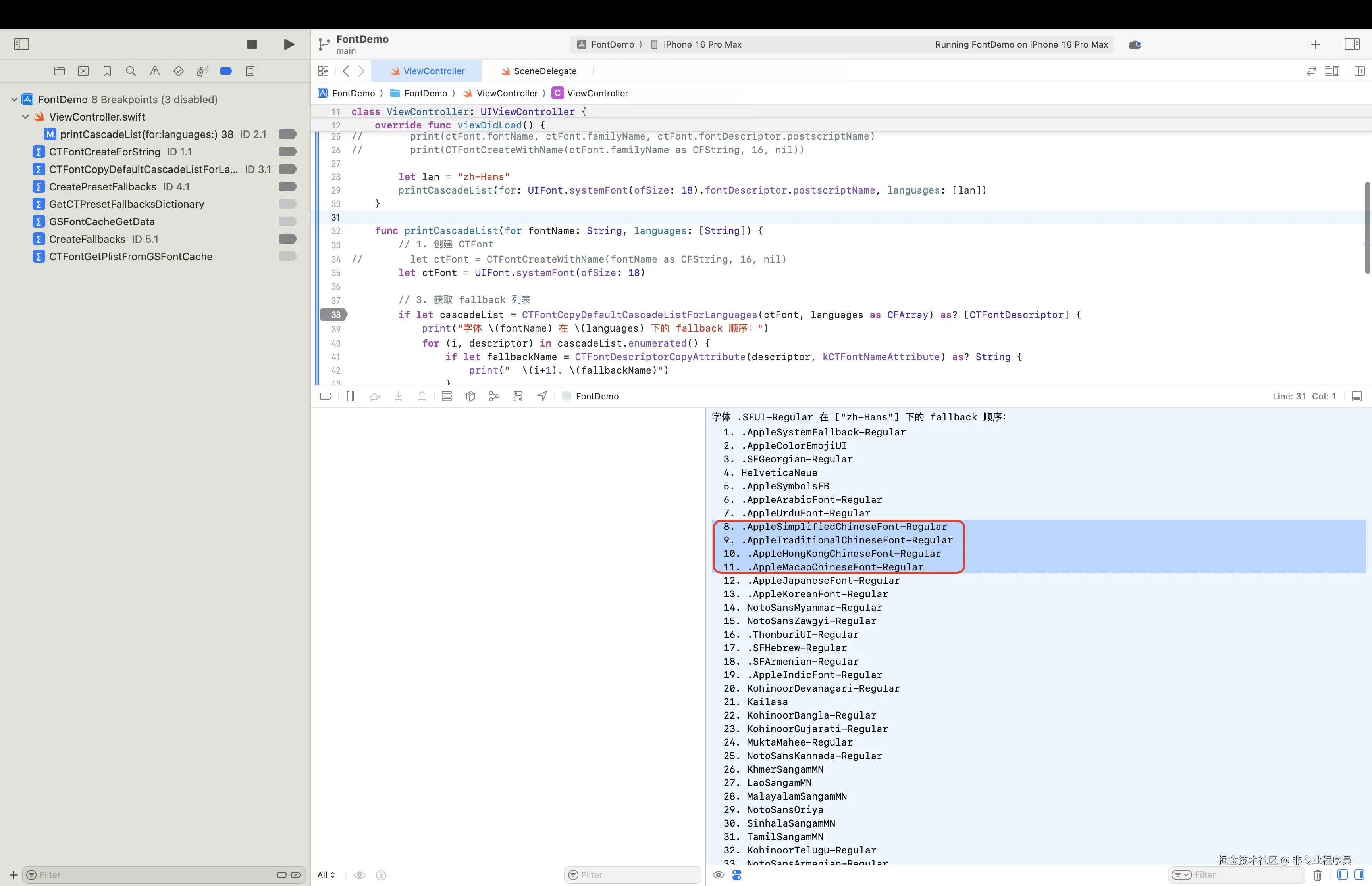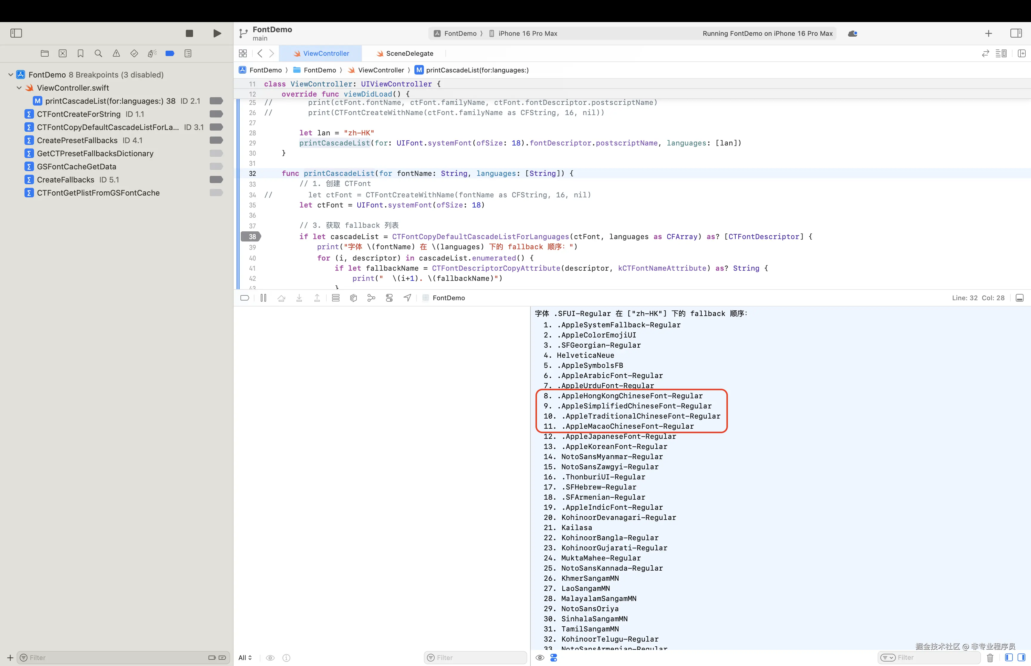 官方文档:[developer.apple.com/documentati...](https://link.juejin.cn?target=https%3A%2F%2Fdeveloper.apple.com%2Fdocumentation%2Fcoretext%2Fctfontcopydefaultcascadelistforlanguages( "https://developer.apple.com/documentation/coretext/ctfontcopydefaultcascadelistforlanguages(")*:*:)