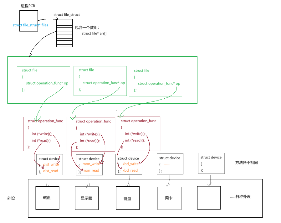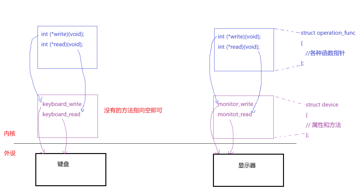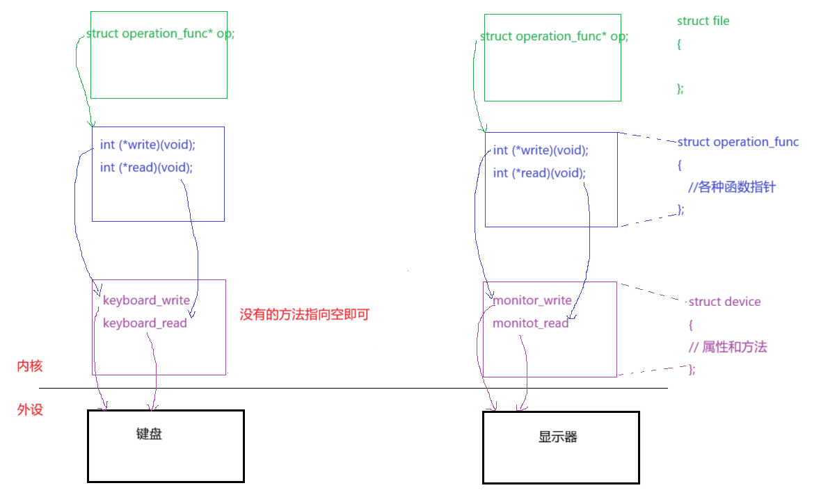 这样的函数指针指向下层的各种设备的方法。问题是上层如何区分应该调用哪个方法呢?判断属性即可,我们可以设置属性字段......方式让上层正确调用。