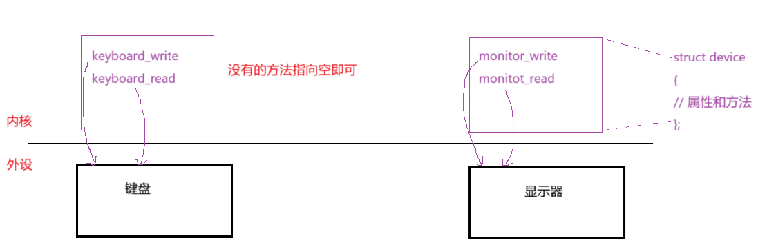 对于每一个硬件设备,都具有不同的读写方法 。例如:键盘设备只有读方法没有写方法、显示器设备只有写方法没有读方法......每一种硬件设备的方法都是大相径庭的。在描述硬件设备中的 struct device