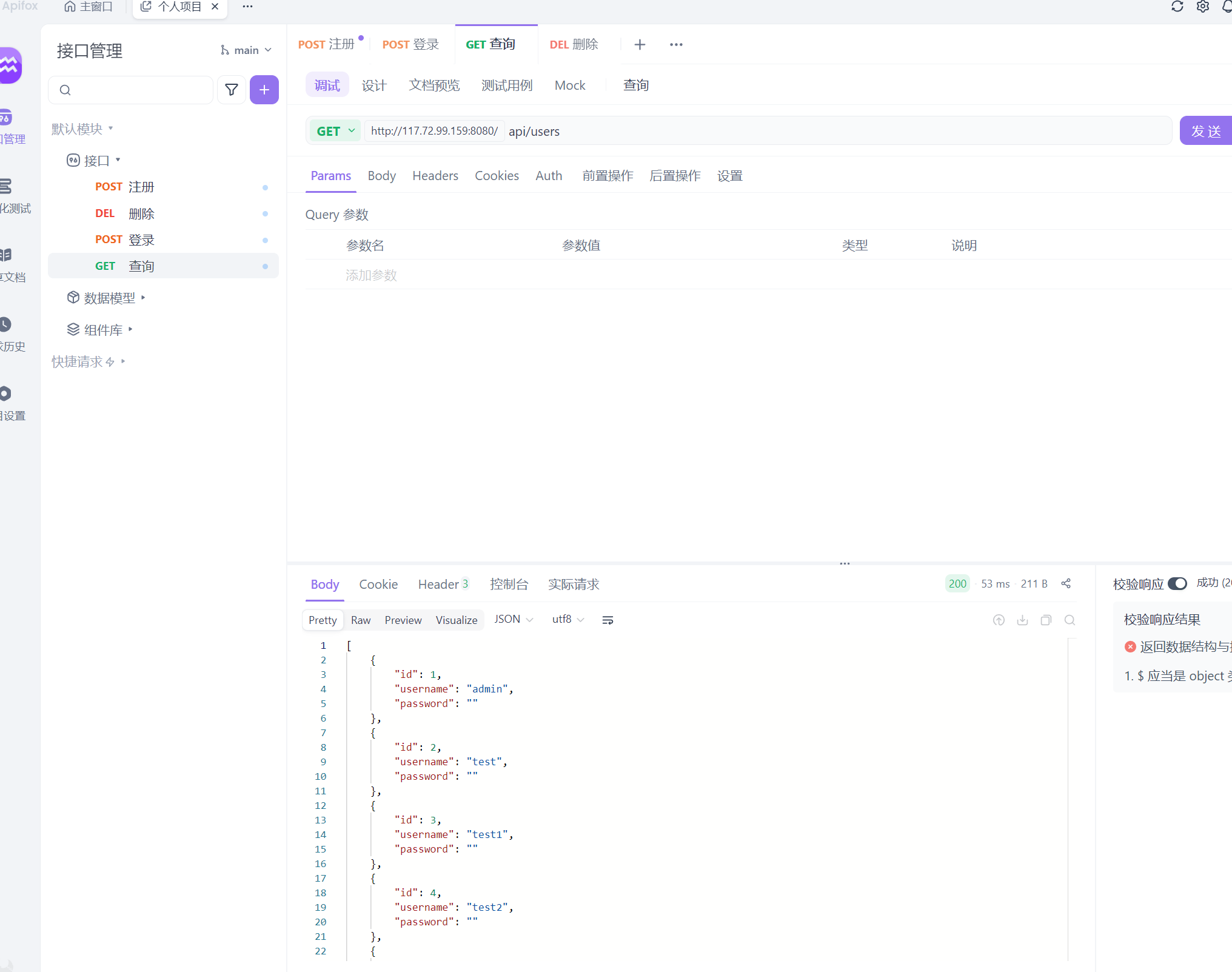 - 使用 curl 或 Apifox 测试: