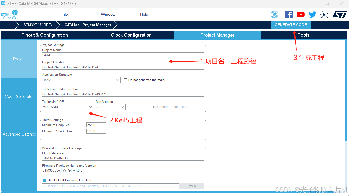 配置工程文件名,保存路径,KEIL5工程输出方式,生成工程。