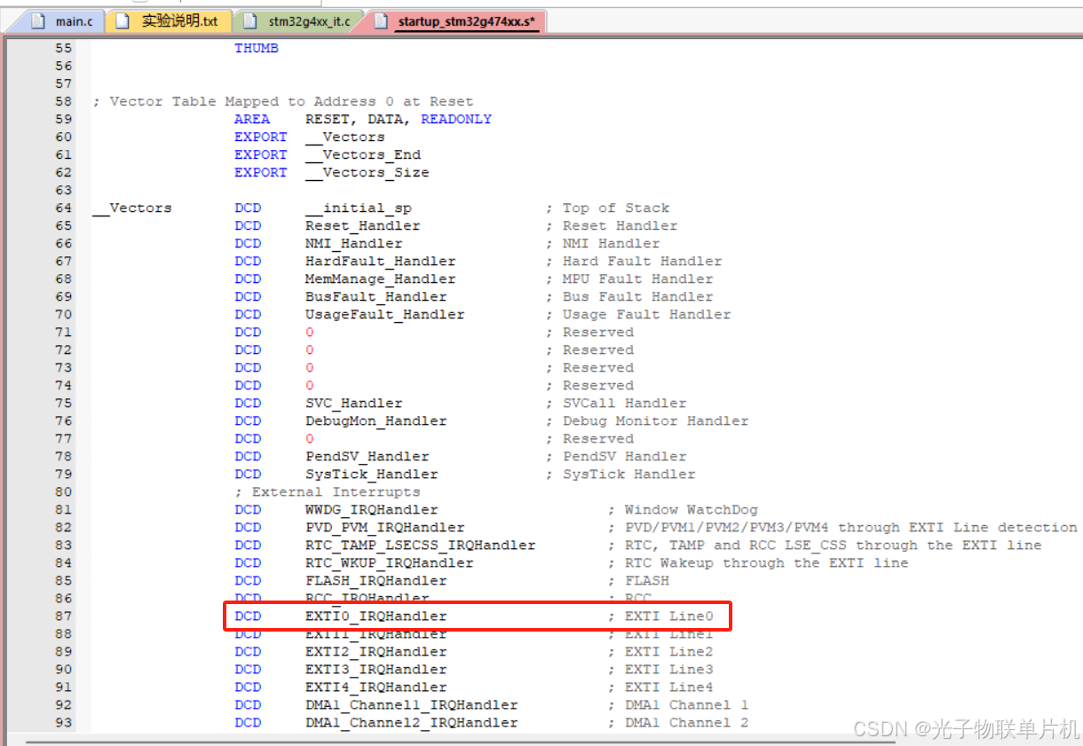 程序中的中断向量表在启动文件startup_stm32g474xx.s中,代码如下: