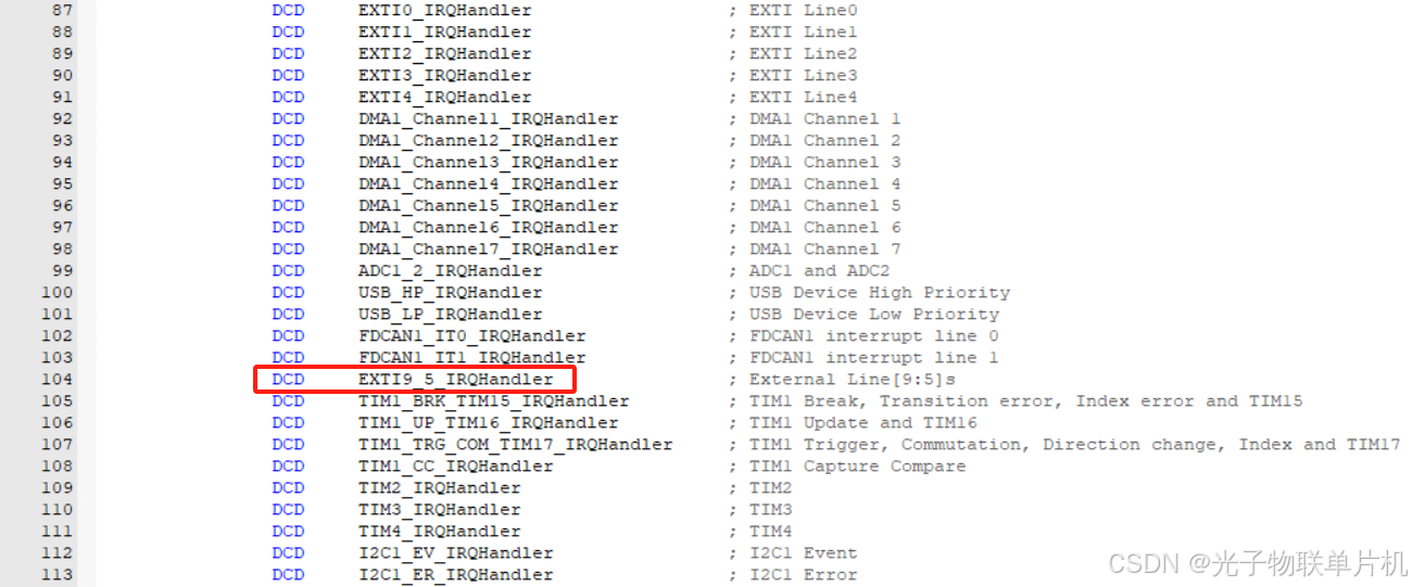 但如果是PA5引脚的外部中断服务程序,向量表中是没有EXTI5_IRQHandler这个函数,由于PA5~PA9是共用中断服务程序,所以PA5的外部中断服务程序就是