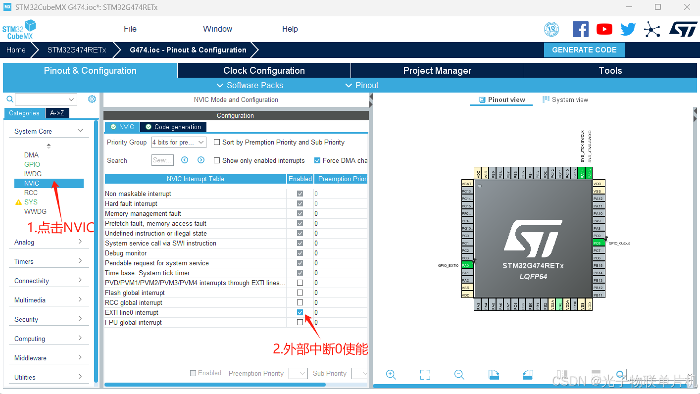 NVIC的核心功能是中断优先级分组、中断优先级的配置、读中断请求标志、清除中断请求标志、使能中断、清除中断等,它控制着STM32G474中断向量表中断号为0-101的102个中断,外部中断信号从核外发出,信号最终要传递到NVIC(嵌套向量中断控制器)。NVIC跟内核紧密耦合,它控制着整个芯片中断的相关功能。