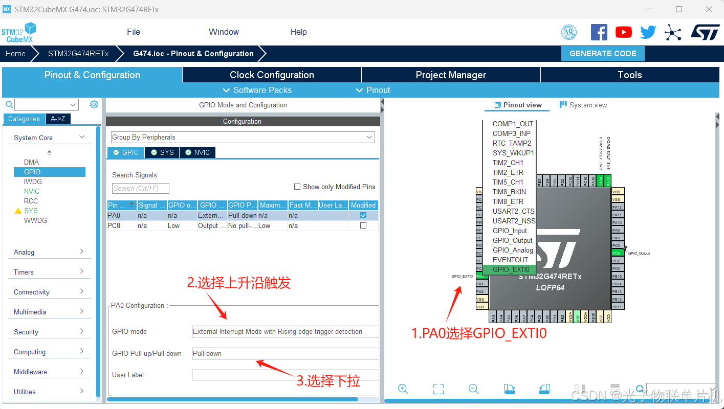 查看STM32G474RET6开发板原理图,PA0引脚跟按键相连,配置PA0引脚为外部中断0引脚,配置PA0引脚下拉,因为是上升沿产生中断,配置成下拉使能,PA0引脚初始电平就稳定,上升沿中断信号就稳。