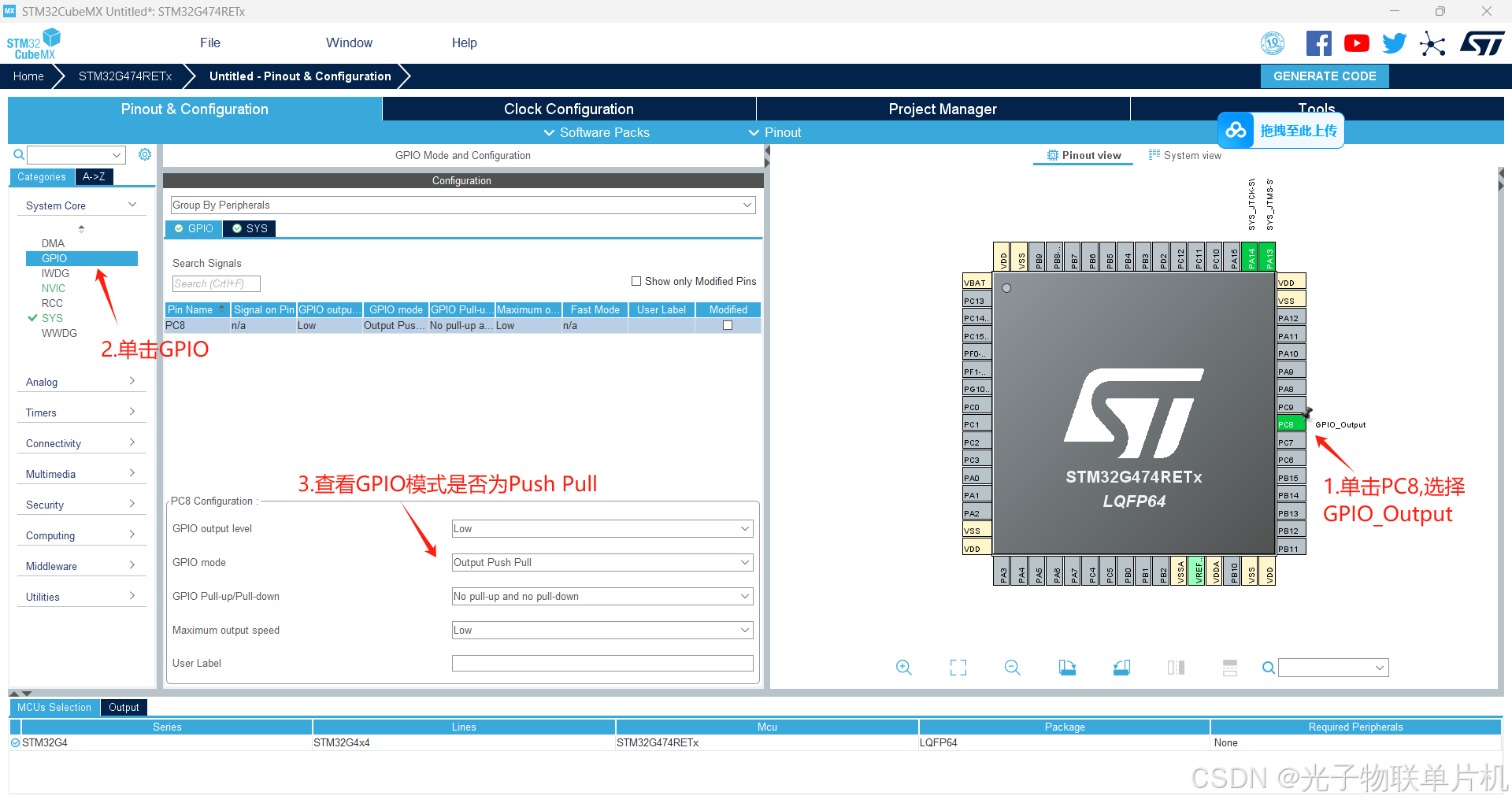 如下图所示,可以查看STM32G474RET6开发板原理图,PC8连接LED灯,所以配置PC8为GPIO输出,推挽输出。