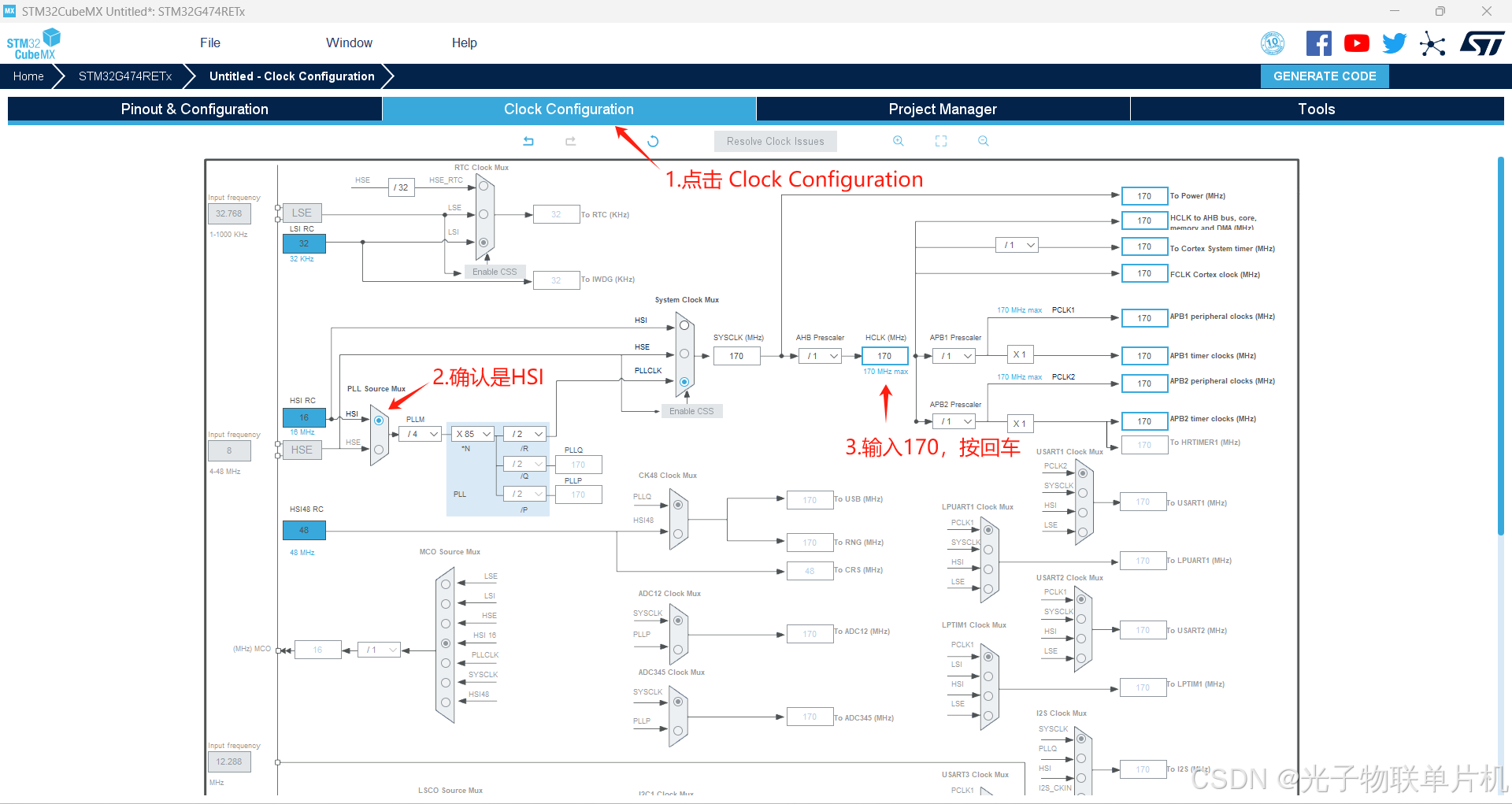 如下图所示,配置系统主频170Mhz,使用内部16MHZ晶振。