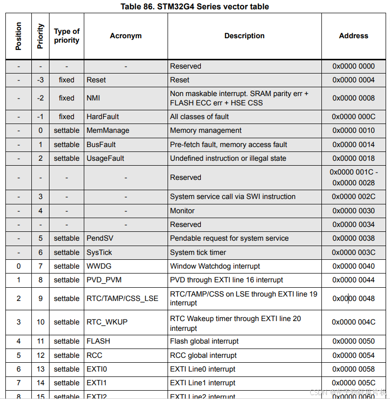 在中断向量表里给我们列出了各种外部中断,黑色的图是内核的中断,这12个系统中断不能被打断也不可以设置优先级,他们的优先级是固定的,且发生事件时必须要响应,后面的图是外设相关的外部中断,STM32G4参考手册文档里有列出所有相关的中断。