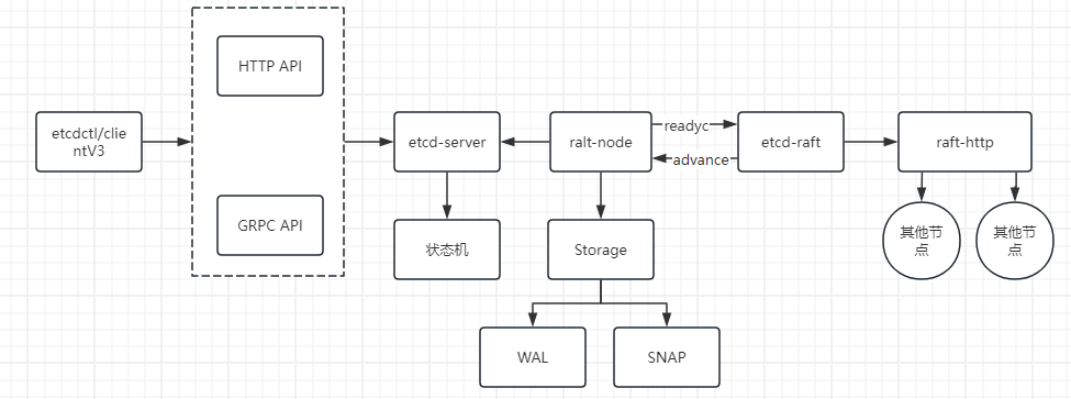 etcd-server模块为外部访问提供了一系列GRPC API。同时,利用GRPC-gateway作为反向代理,使得etcd-server模块具备向外部提供HTTPAPI的能力。