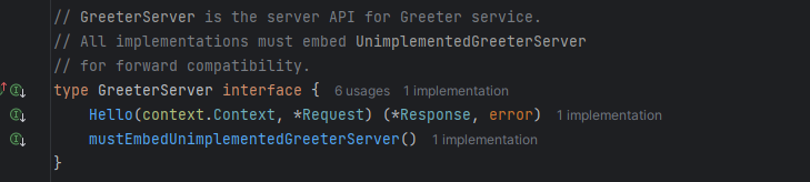 在hello_grpc.pb.go文件中,我们可以看到protoc自动生成了GreeterServer接口,其中包含了Hello方法。