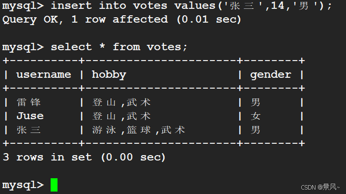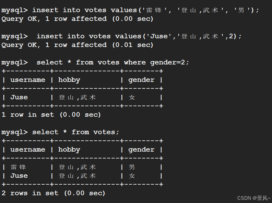 向表中插入记录时,被调查人的性别只能从男和女中进行二选一,被调查人的爱好可以从提供的若干个选项中进行多选一或多选多,多个爱好之间需要通过英文逗号隔开。