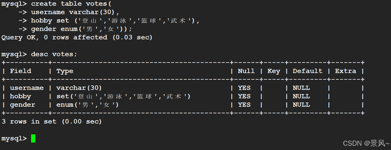 比如人的性别只能从男和女中进行二选一,因此可以定义成enum类型,而人的爱好在提供的选项中可能存在多个,因此可以定义成set类型。