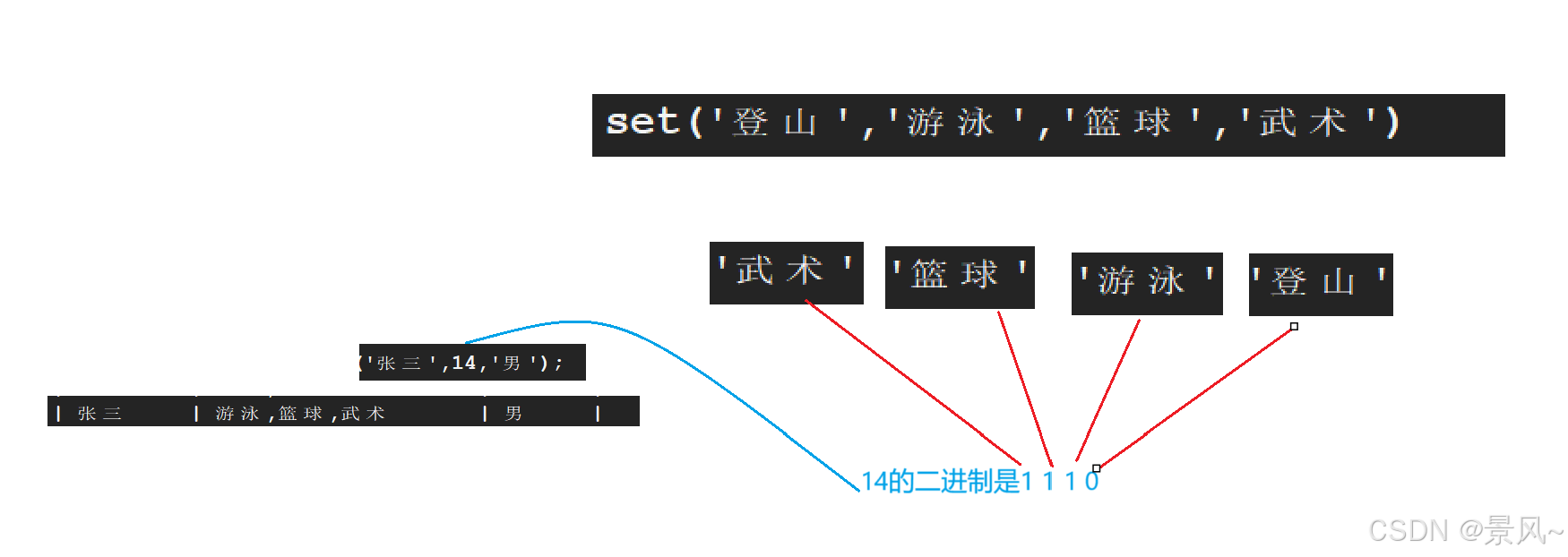 集合类型:在定义字段时指定取值范围;可从成员中选取一个或多个值;存储空间由成员个数决定 |