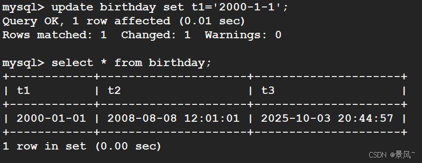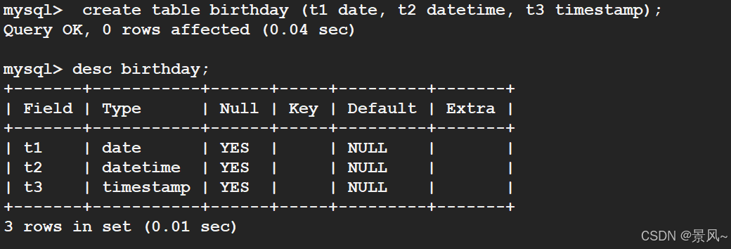 创建一个表,表当中包含date、datetime和timestamp三种时间日期类型的列。