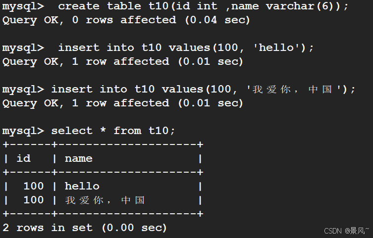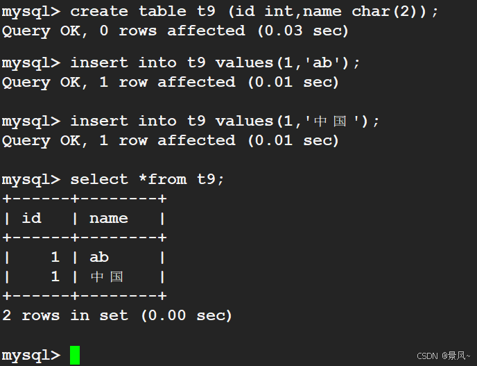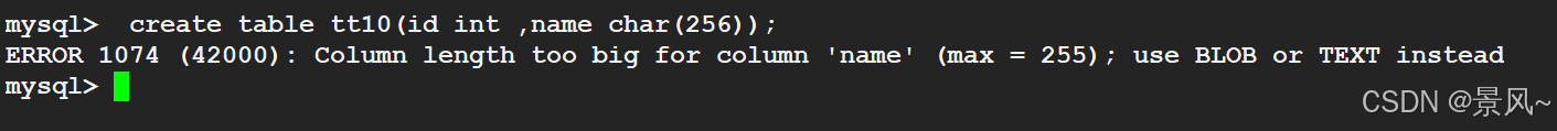 说明: char(2) 表示可以存放两个字符,可以是字母或汉字,但是不能超过2个, 最多只能是255