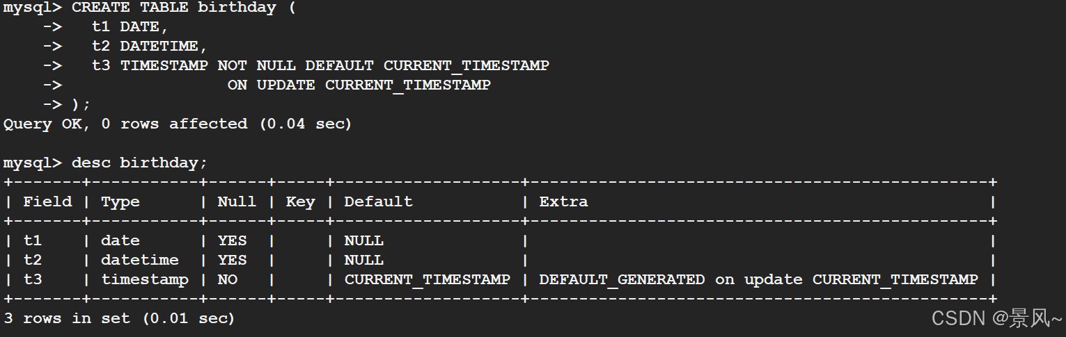 查看表结构可以看到,timestamp类型的t3列是不允许为空的,它的默认值为CURRENT_TIMESTAMP
