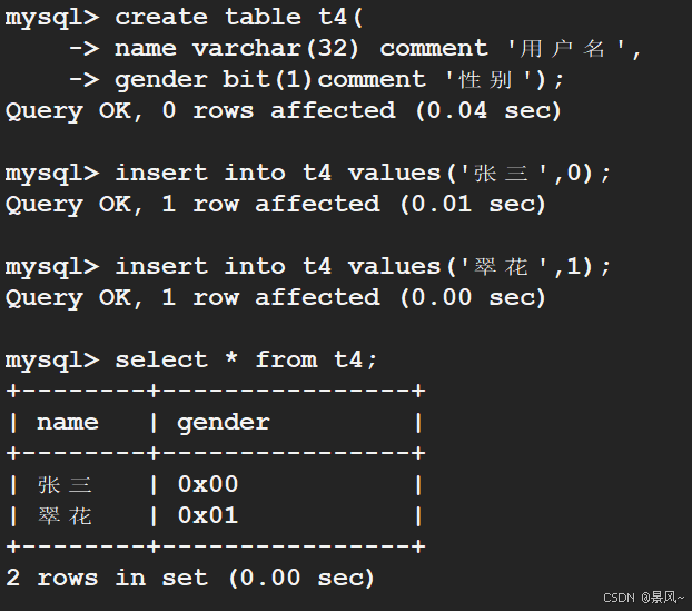 创建一个表,表当中包含用户名name和用户性别gender,其中gender的类型可以指定为1位bit类型,因为性别只有男和女两种取值,使用1个比特位来表示用户的性别就可以节省空间。如下: