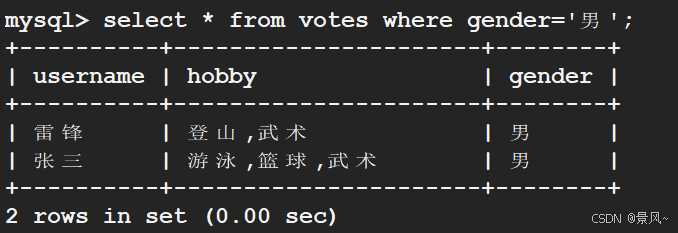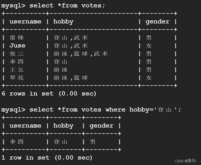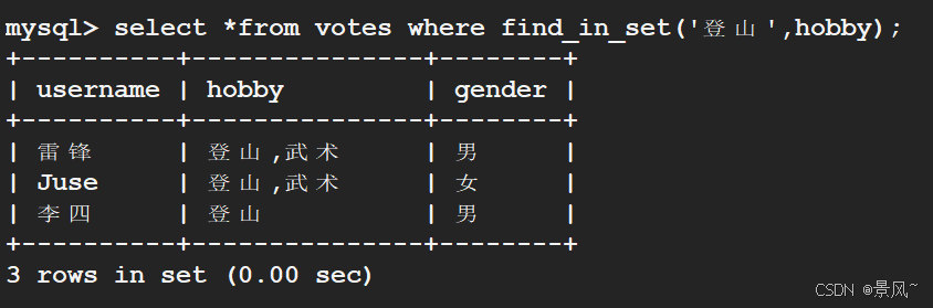 这时就可以通过select搭配find_in_set函数,来筛选出爱好包含登山的人的信息了。如下: