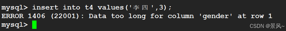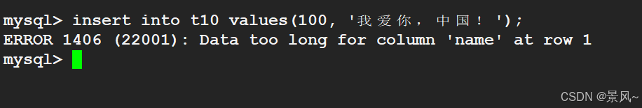 如果插入的字符个数超过了6个,那么在插入数据时就会产生报错。如下: