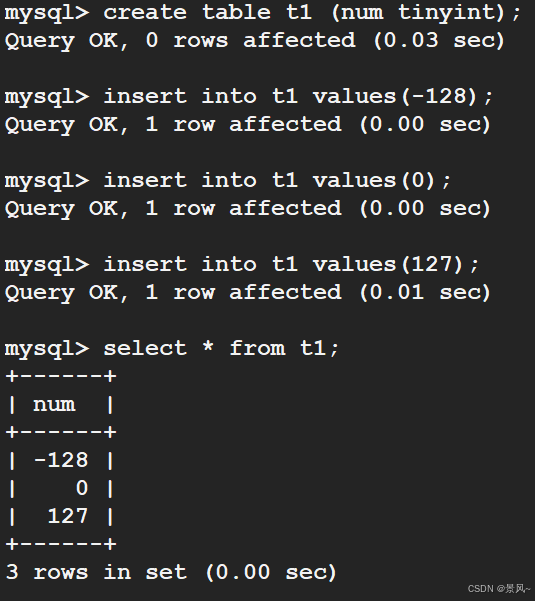 由于tinyint类型占用1字节,因此有符号tinyint的取值范围为-128~127,插入该范围内的数据时都能成功插入。如下: