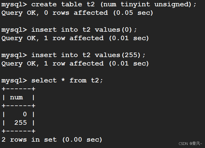 由于tinyint类型占用1字节,因此无符号tinyint的取值范围为0~255,插入该范围的数据时都能成功插入。如下: