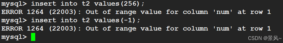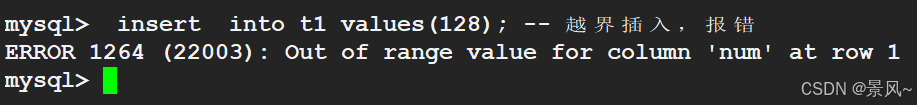 如果插入的数据不在-128~127范围内,那么插入数据时就会产生报错。如下: