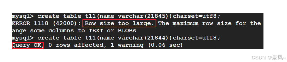 因此在定义编码格式为utf8的表时,varchar(L)中的L如果超过了21844,则会产生报错。如下: