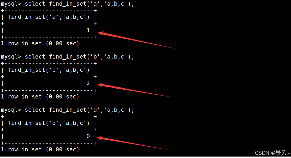 通过select可以对find_in_set函数进行验证,依次查找集合a,b,c中是否包含字符a、b、d,这时在查找字符a和b时就会得到其在集合中的下标,而在查找字符d时就会得到0值。如下: