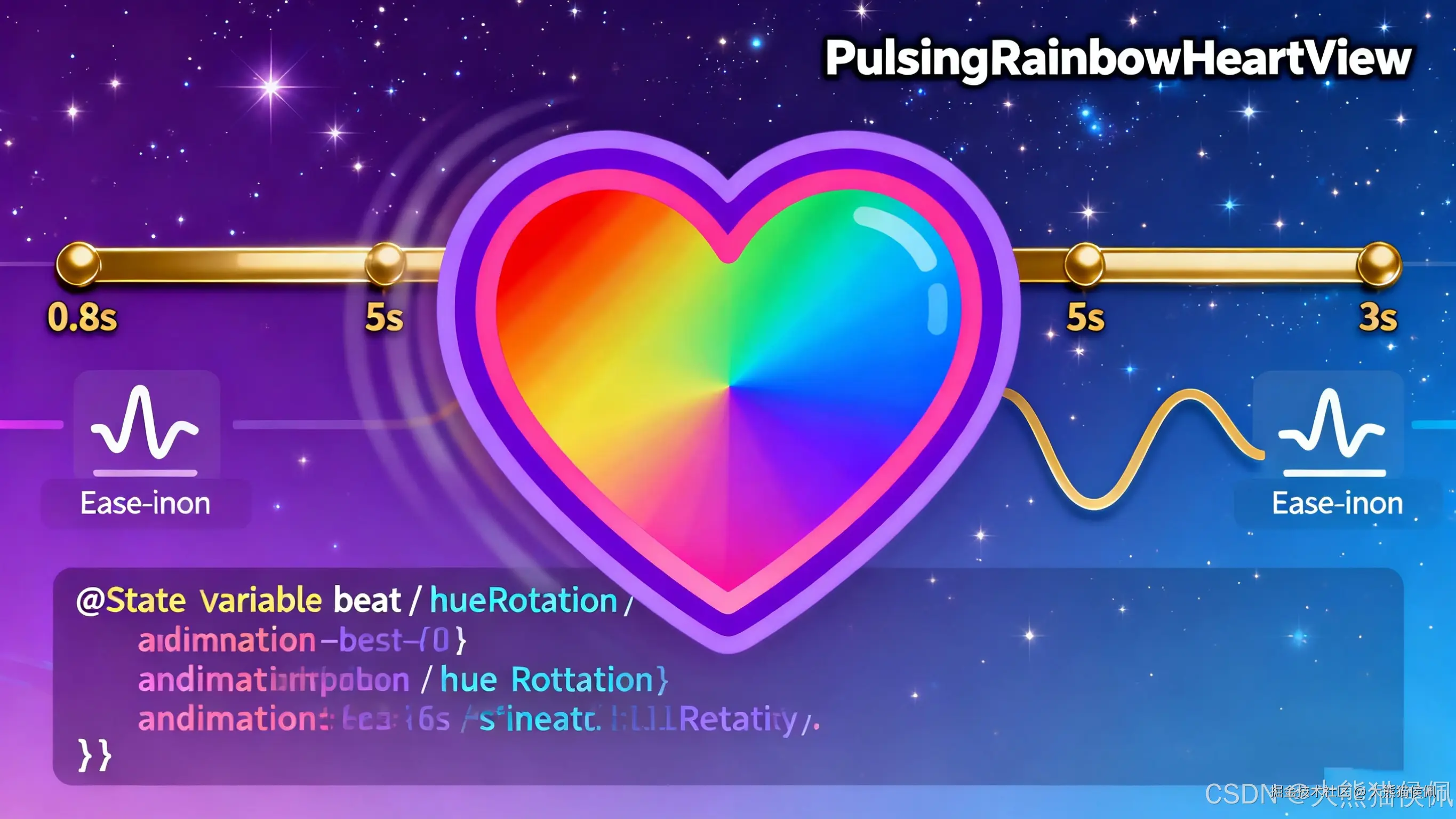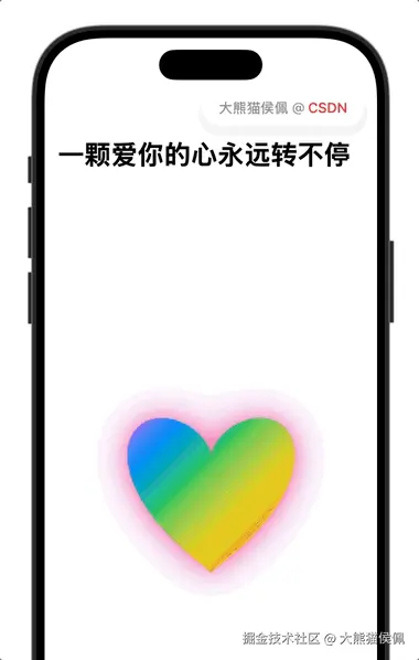 )。 - PulsingRainbowHeartView :使用这个心形路径绘制 彩虹渐变、心跳动画、旋转渐变效果,并添加阴影。