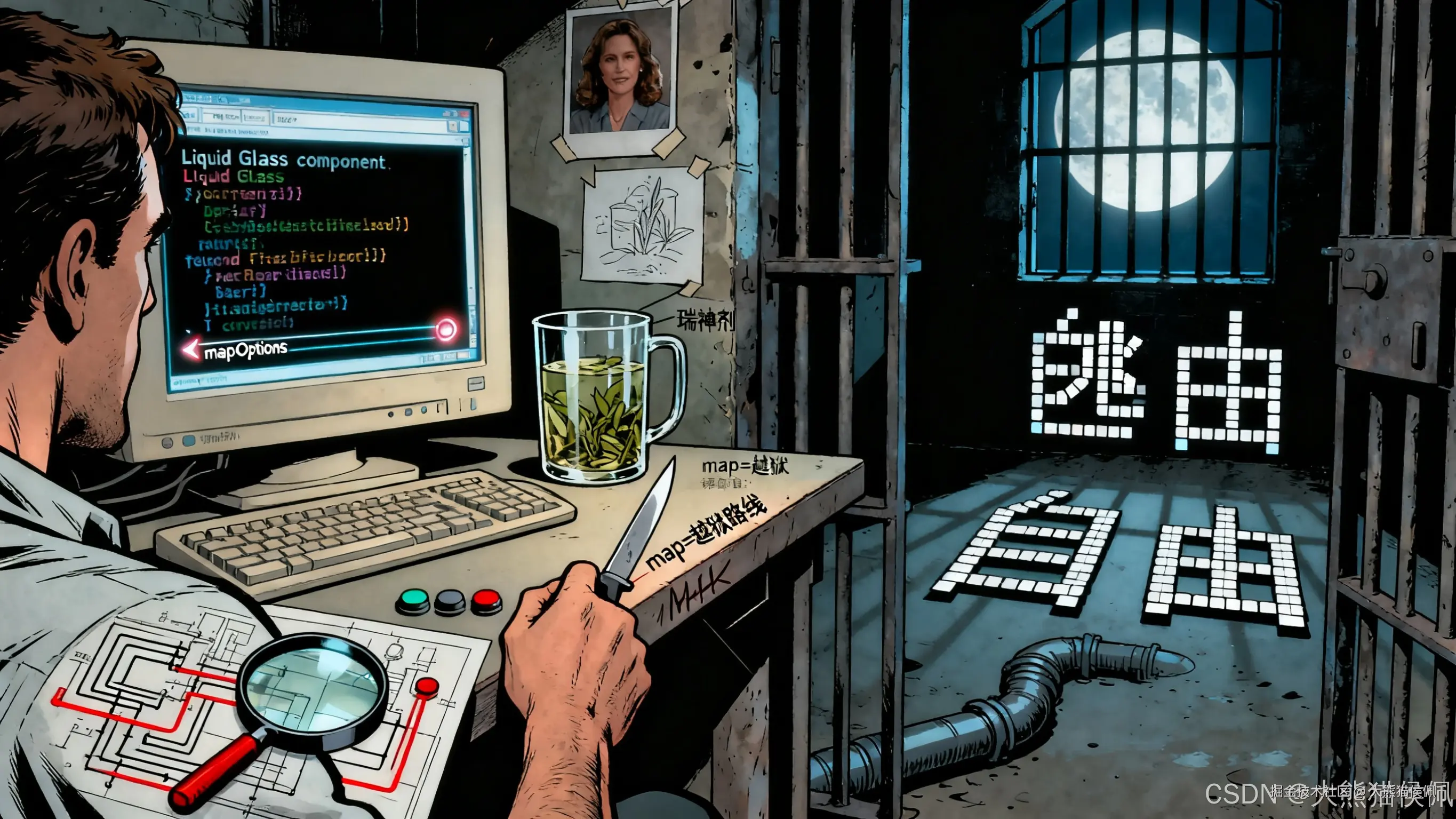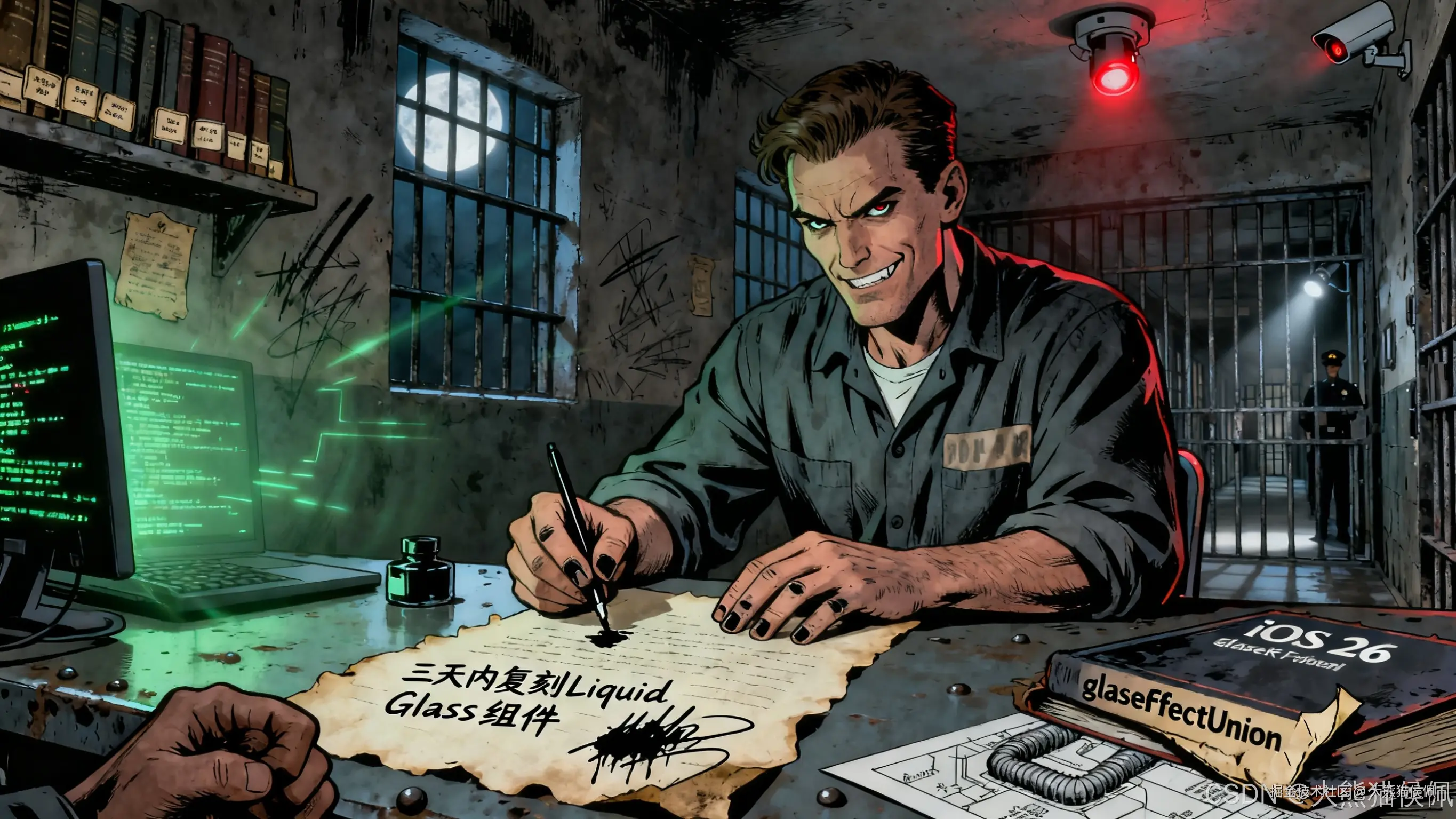 肖申克监狱的高墙里,安迪·杜佛兰坐在冰冷的铁桌前,面前摊着一张皱巴巴的纸------典狱长诺顿的亲笔命令:"三天内复刻苹果地图的 Liquid Glass 组件,要是搞砸了,你那间'图书馆'就等着变柴火堆。"