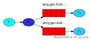 - P:生产者,也就是要发送消息的程序,但是不再发送到队列中,而是发给X (交换机)