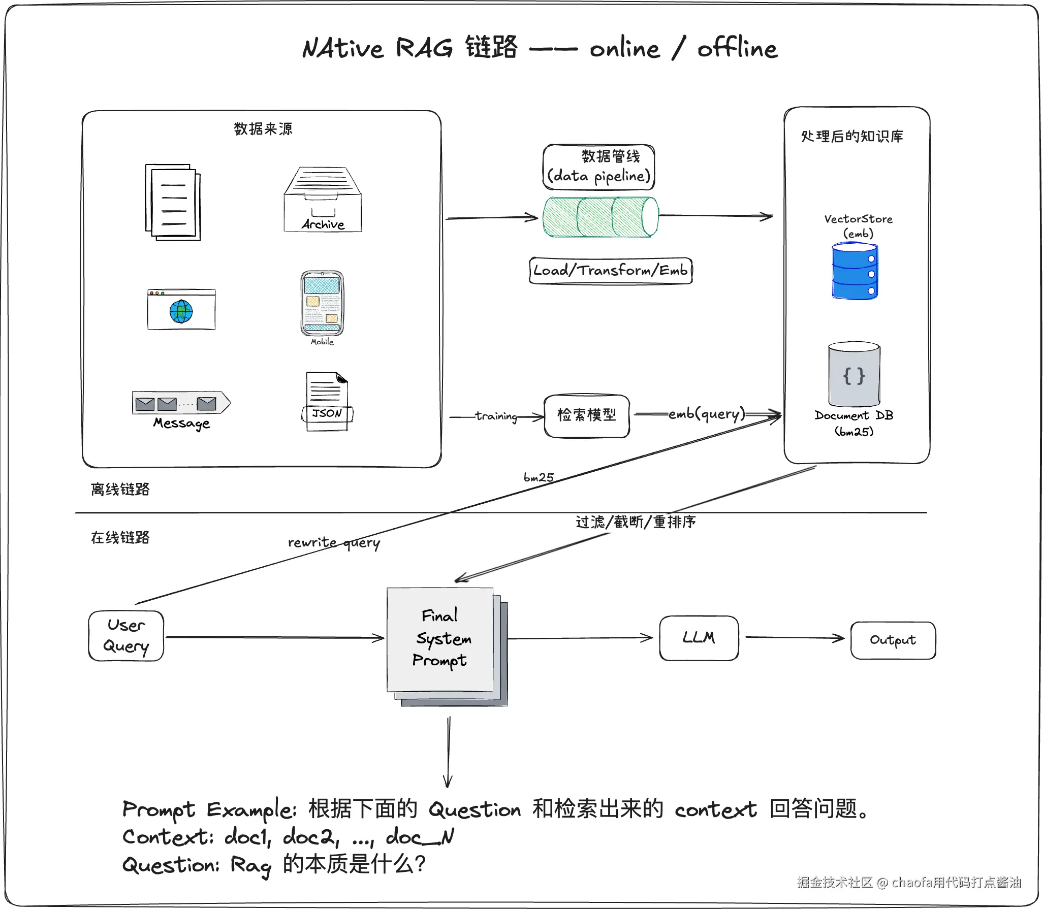 一般来说可以分成两个不同的链路:离线和在线。具体的代码可以参考:动手学习大模型-中文版-第八章-native-rag 源代码
