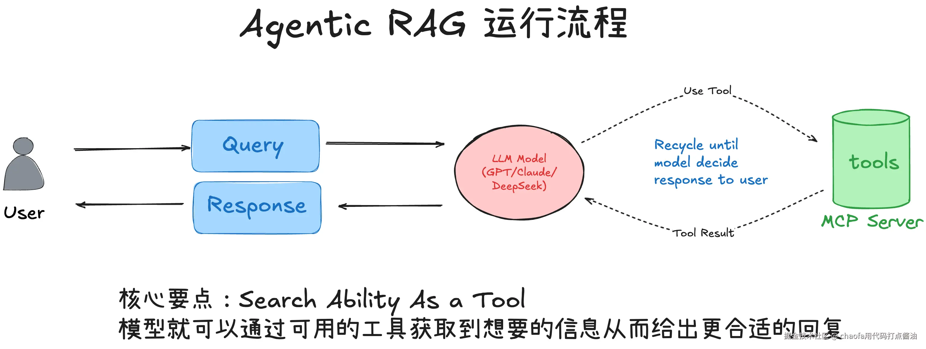 但网络上有很多文章,把 Agentic RAG 说得玄乎,故意制造难懂的概念从而达到抬高自身的目的。但实际上我们只需要理清楚两个概念,就可以知道什么是 Agentic RAG。