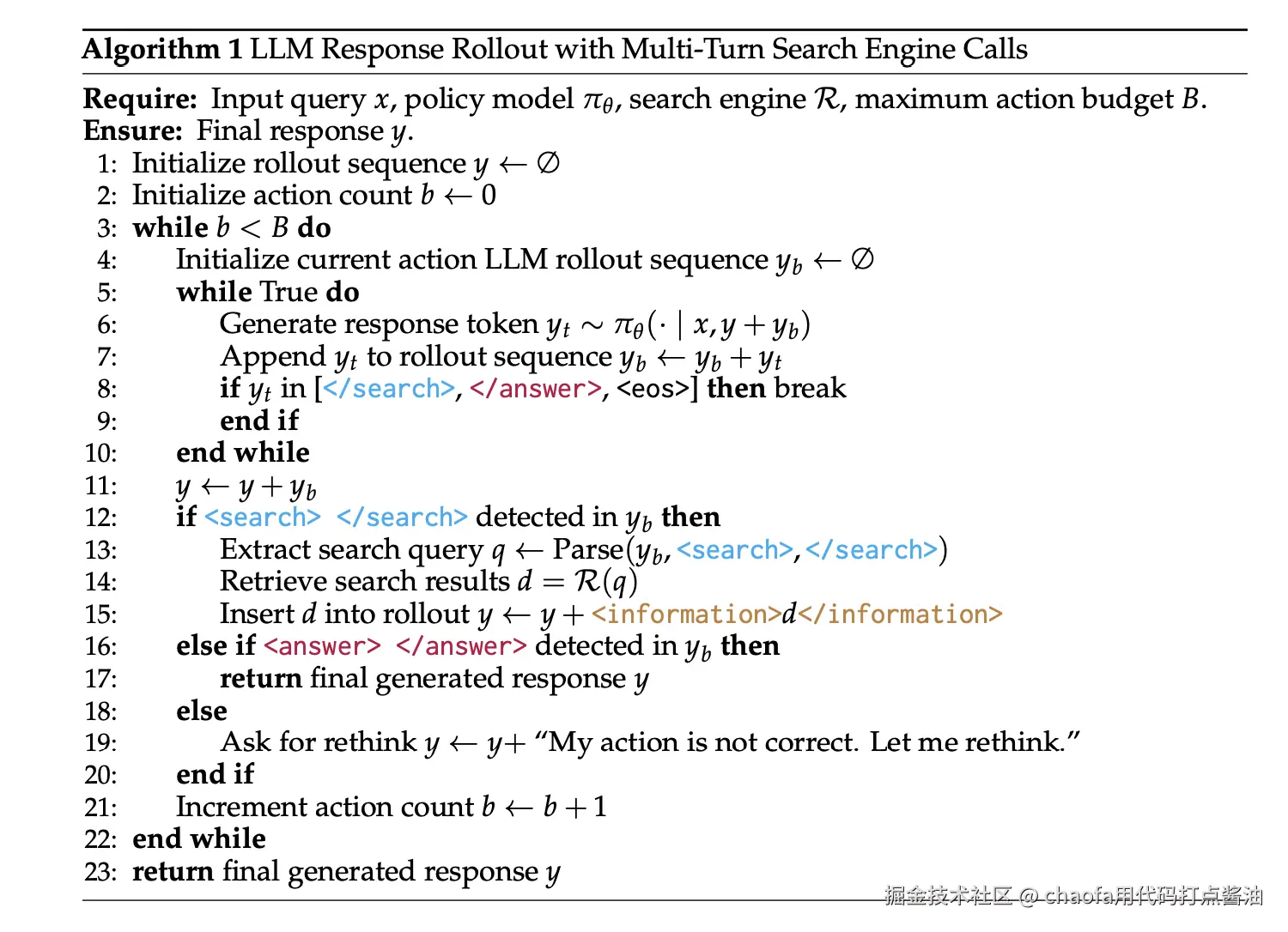 以下是 Search-R1 的简化实现示例(完整实现可以参考原 Github 实现),展示了如何使用强化学习训练 Agentic RAG 模型:当然实际上 Search-R1 使用的 GRPO