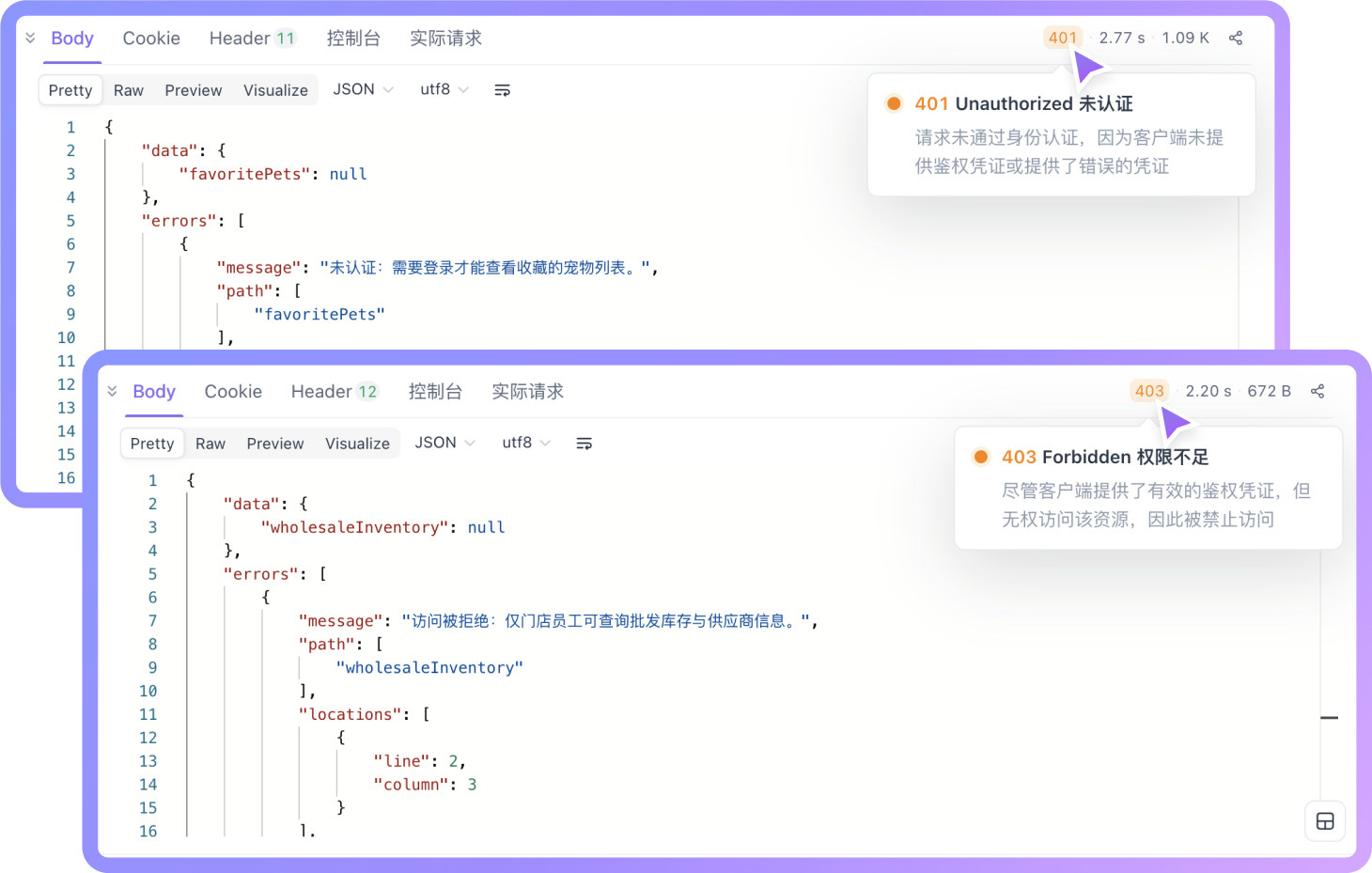 当鼠标悬停在接口返回状态码上时,系统会显示该状态码的详细说明,帮助开发者快速理解响应状态,无需额外查询就能获得状态码的具体含义,提升了接口调试的效率和便利性。