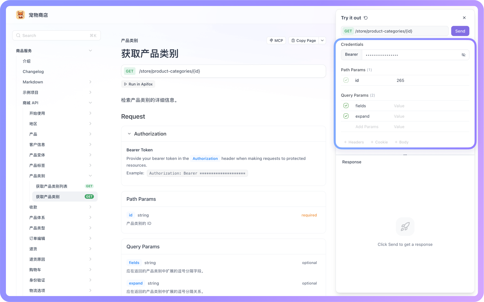 在线文档的调试界面使用更简洁的外观,仅显示文档中定义的参数类型,使界面更加清晰直观,减少视觉干扰。文档使用者能够更快速定位填写参数的值,提升调试效率与使用体验。