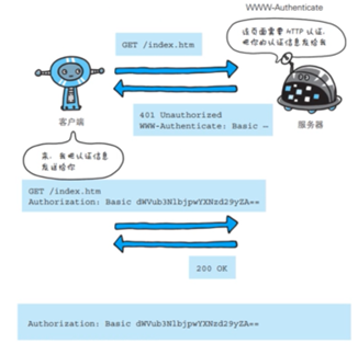 HTTP服务器在每次收到请求包后,根据协议取得客户端附加的用户信息(BASE64加密的用户名和密码),解开请求包,对用户名及密码进行验证,如果用户名及密码正确,则根据客户端请求,返回客户端所需要的数据;否则,返回错误代码或重新要求客户端提供用户名及密码。