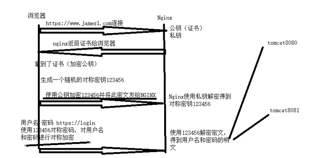 - 浏览器再随机生成一个对称加密的密钥,用公钥对对称加密的密钥进行加密,得到一个密文(对称加密的密钥)将其发