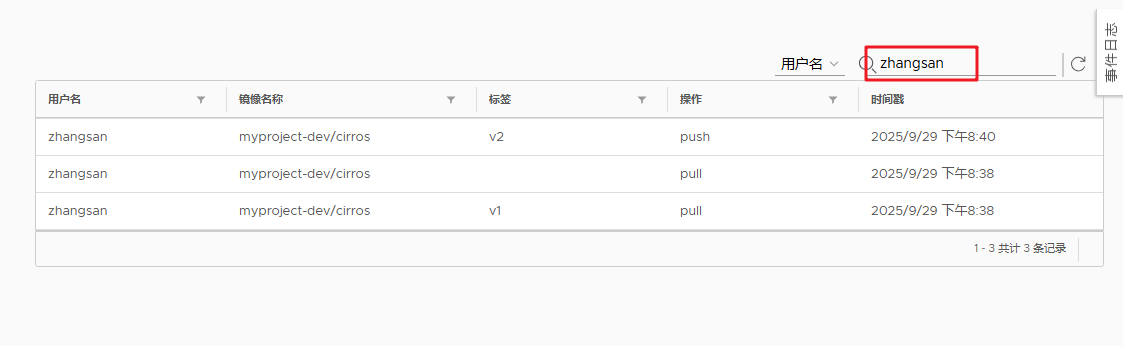- 可按"时间范围""操作类型""用户名"筛选日志,查看镜像上传、删除、用户创建等操作记录。