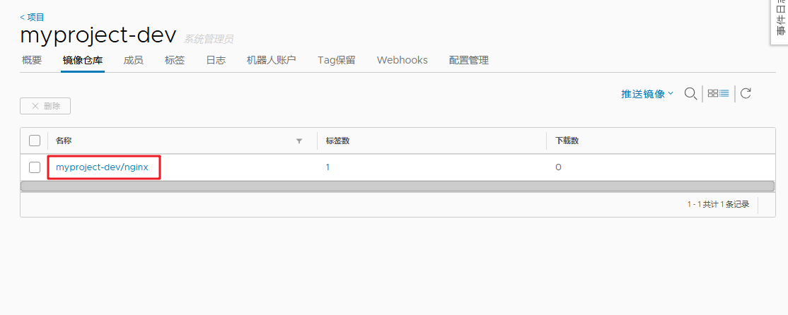 # 5. Web 界面验证:进入 myproject-dev 项目,可看到上传的 nginx:v1 镜像