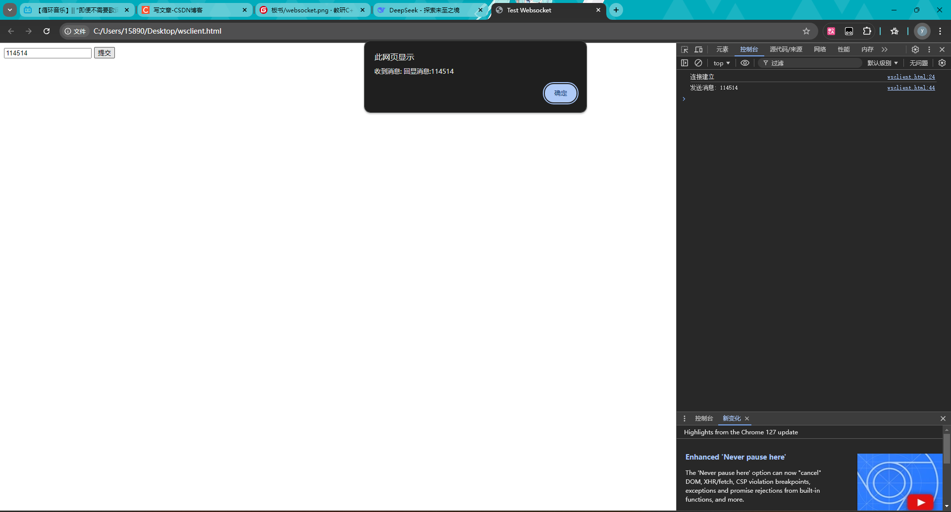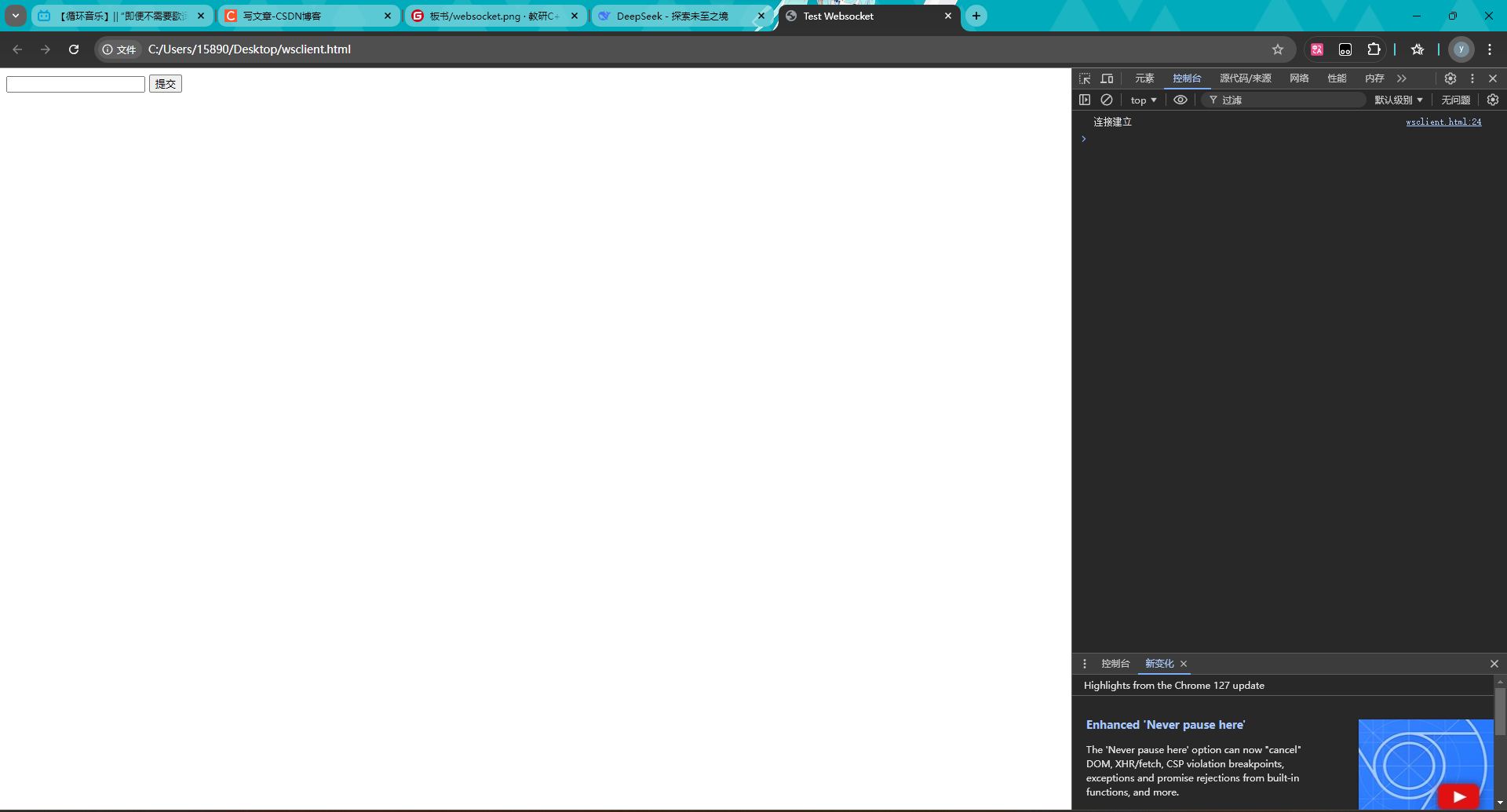如果我们想要看到websocket通信,可以使用下面的html代码进行,注意服务器地址改成你自己的: