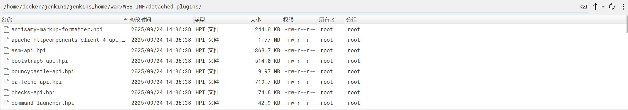 接下来只需将它拷贝到 Jenkins 的插件目录中即可,插件目录的位置在启动 Jenkins 容器时所挂载的宿主机目录 <font style="color:rgb(77, 77, 77);">/war/WEB-INF/detached-</font><font style="color:rgb(78, 161, 219) !important;">plugins</font>
